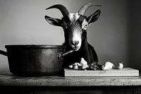 Een charmant zwart-wit portret toont een nieuwsgierige geit die rustig aan een pot met verse groenten snuffelt. Haar wetende blik en de rustieke achtergrond geven de foto een leuke touch. Perfect voor in de keuken, het brengt een speelse sfeer en stimuleert de verbeelding tijdens het koken.