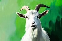 Dit ontwerp van een geit die recht in de camera kijkt is een prachtige toevoeging aan je ruimte. De rijke kleuren van het groen in de achtergrond brengen een kalmte en rust, terwijl de witte geit met haar scherpe blik het ontwerp levendig maakt. Het subtiele contrast tussen het dier en de achtergrond zorgt voor een aangename visuele balans, waardoor dit werk perfect is voor elke ruimte die een vleugje natuur en karakter kan gebruiken. De gedetailleerde weergave van de geit maakt het een aantrekkelijk kunstwerk voor liefhebbers van dieren en unieke, moderne kunst.