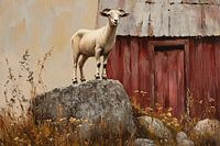 Dit schilderij vangt een rustiek tafereel van het platteland, waarin een geit zelfverzekerd bovenop een verweerde rots staat met een oude, rode schuur op de achtergrond. De warme, aardse tinten en de zorgvuldige penseelstreken geven het geheel een nostalgische sfeer, alsof het een glimp is van een eenvoudig, landelijk leven. De geit…