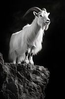 Een majestueus dier rijst op in een dramatische houding op een steile klif, omgeven door mysterieuze mist. De elegante witte vacht en opvallende horens geven deze geit een aura van grandeur en kracht. Dit schilderij is ideaal voor een woonkamer of een modern kantoor en brengt een combinatie van nabijheid tot de natuur en tijdloze…