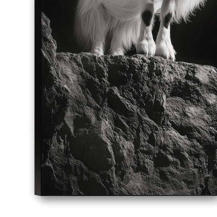 Een majestueus dier rijst op in een dramatische houding op een steile klif, omgeven door mysterieuze mist. De elegante witte vacht en opvallende horens geven deze geit een aura van grandeur en kracht. Dit schilderij is ideaal voor een woonkamer of een modern kantoor en brengt een combinatie van nabijheid tot de natuur en tijdloze elegantie in elke kamer.