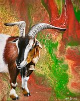 Dit schilderij toont de prachtige geit "Anton" van de Kaiserstuhl. Precies geschilderd op een vloeibare kunstachtergrond. Dit betekent dat de achtergrond expressionistisch abstract is en door mij is gemaakt met de giettechniek.