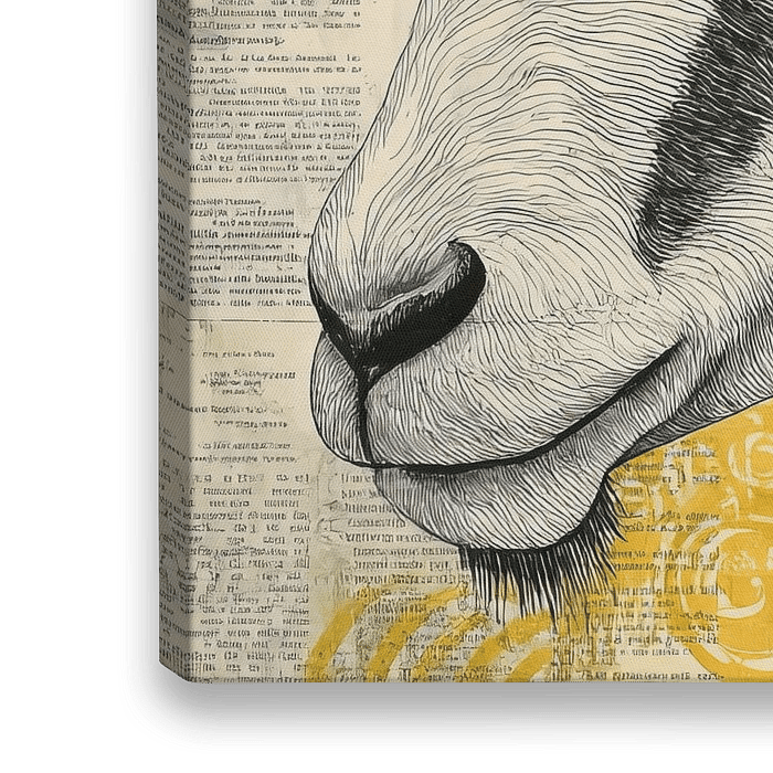 Geit - Op dit dieren schilderij zie je een gestileerde geit met opvallende hoorns, die prachtig is versierd met kleurrijke patronen en lijnen, tegen een achtergrond van oude tekst.