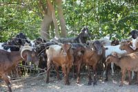 Geiten onder bomen op de dam bij het meer / stuwmeer van Kerkini in Griekenland