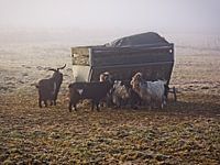 Geiten in een weiland bij een mistige winter zonsopgang bij Nationaal Park de Groote Peel in Ospeldijk (Limburg, Nederland).