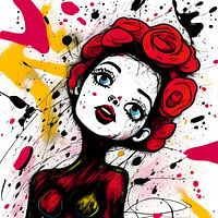 Een vrolijk kunstwerk met een meisje met rode rozen in haar haren.