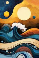 Een gestileerde, abstracte scène toont kolkende oceaangolven onder een sterrenhemel met hemellichamen. Het samenspel van diepblauwe, oranje en beige tinten creëert een dynamische, vloeiende compositie.