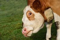 Close-up van een koe in de wei die haar kop zijwaarts draait en met haar ogen rolt