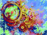 Wat meteen opvalt is de grote, gestileerde wijzerplaat die een kwart van het schilderij domineert. In plaats van de normale cijfers zijn hier twee uur-, twee minuten- en één secondewijzer te zien. Daarachter bevindt zich een veelheid aan tandwielen en mechanische onderdelen - een wirwar van vormen en structuren die het complexe binnenwerk van een klok vormen. Deze elementen symboliseren tijd - ongrijpbaar, ingewikkeld, maar toch een constante in ons leven.