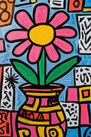 Gekleurde Bloem in Vaas - Op dit bloemen schilderij zie je een grote, vrolijke bloem met een gele kern en roze bloemblaadjes, die in een kleurrijke vaas staat tegen een heldere blauwe achtergrond met abstracte vormen.