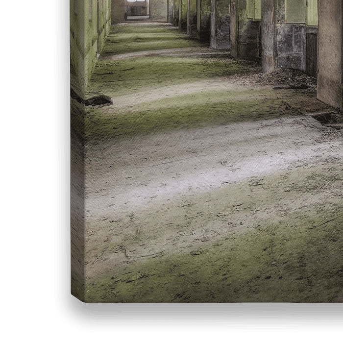 Een gekleurde, lichte en vervallen gang op de begane grond van een verlaten ziekenhuis. De uitgestrekte begroeiing door deels bomen en struiken zorgen voor een mooi kleurverloop in de achtergrond.