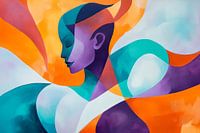 Er ontvouwt zich een harmonieuze compositie van zachte, vloeiende lijnen en gedurfde kleuren, terwijl een gestileerd silhouet in paars en groen op de voorgrond treedt. Deze eigentijdse weergave van lichaamstaal en innerlijke rust geeft elke ruimte een inspirerende uitstraling en is bijzonder geschikt voor de woonkamer of een creatief kantoor.