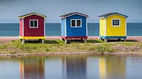 Bekende gekleurde strandhuisjes bij Cavendish Newfoundland, staan aan het strand. Uitzicht over zee en leuk gekleurd in de kleuren rood, geel en blauw.