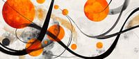 Fel oranje cirkels dansen over een elegant, monochroom oppervlak, terwijl gebogen zwarte lijnen een dynamische beweging toevoegen. Deze levendige compositie straalt energie en creativiteit uit, perfect voor een moderne woonkamer of een inspirerend kantoor, waar het de sfeer verlicht en energie geeft.