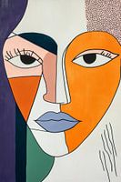 Een fascinerend samenspel van kleuren en vormen komt samen in dit expressieve portret. De harmonieuze compositie van oranje, paars en zachte huidtinten brengt een levendige energie in elke kamer. Ideaal voor de woonkamer, voegt het een modern, artistiek accent toe en nodigt uit tot een gesprek.