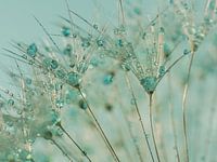 "Gekleurde druppels worden door de pluisjes gedragen" is een macrofoto van druppels op de pluisjes van een paardenbloem met een achtergrond met de kleur mintgroen (cyaan, blauwgroen). De pluisjes van de paardenbloem zijn door het licht een beetje goud- zilver kleurig.