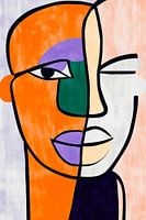 Een krachtig samenspel van kleuren en vormen dat de kijker boeit. De expressieve afbeelding combineert levendige tinten oranje, groen en paars, terwijl de opvallende lijnen het gezicht karakter geven. Dit kunstwerk zou perfect staan in een woonkamer en een gesprek stimuleren.