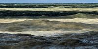 De golven vlak aan de kust krijgen aparte kleuren van de afkalvende krijtrotsen aan de Normandische kust bij Le Tréport in Frankrijk.