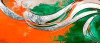 Er ontvouwt zich een spel van levendige kleuren: fel oranje harmonieert met verfrissend groen, terwijl zilveren golven elegant door het beeld stromen en dynamiek uitstralen. Deze compositie geeft een artistieke energie aan elke kamer en is bijzonder geschikt voor de woonkamer, die een ontmoetingsplaats voor creatieve inspiratie wordt.