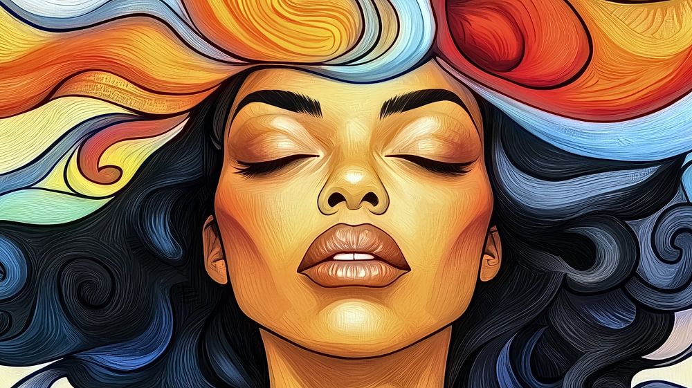 Digitaal kunstwerk van een serene zwarte vrouw met gesloten ogen, haar haar transformerend in levendige, vloeiende golven van kleur. Dit inspirerende beeld viert diversiteit, individualiteit en de schoonheid van zelfexpressie. De harmonieuze kleurencombinaties en vloeiende dynamiek geven het kunstwerk een dromerige maar krachtige uitstraling. Perfect voor thema's als empowerment, creativiteit en diversiteit.