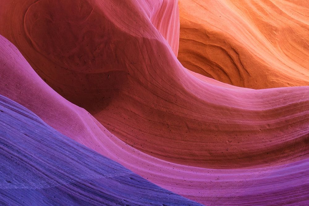 Licht valt in een ravijn en creëert verschillende kleurschakeringen - van lichtoranje tot donkerpaars.