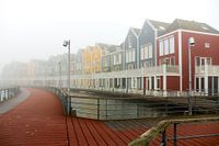 Gekleurde huizen in de mist aan de Rietplas, de Vlondertuin te Houten. Foto genomen na de nieuwjaarsduik in de Rietplas.