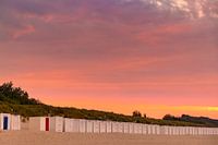 Prachtig roze gekleurde lucht met de strandhokjes op het strand van Vrouwenpolder