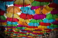 Vrolijk gekleurde paraplu's in een romantisch straatje in Parijs.