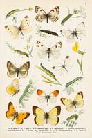 Educatieve plaat met vlinders en hun rupsen op blad. De latijnse namen staan onder de plaat. Wij zien o.a. verschillende witjes, het koolwitje en de citroenvlinder.