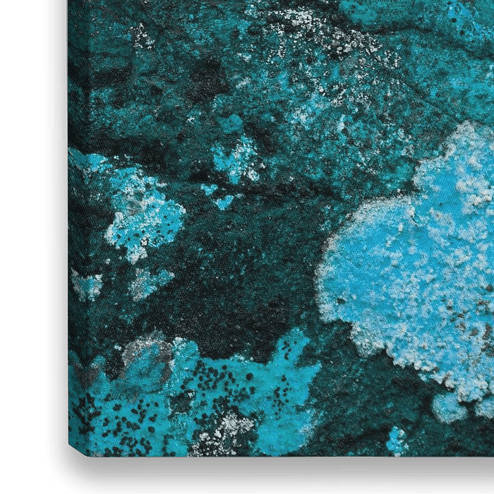 Je ziet hier een rots met verschillende korstmossen. Gevonden en gefotografeerd tijdens mijn vakantie in Schotland, Loch Torridon. De turquas/blauwe tinten zijn ontstaan door een nabewerking. Deze foto gaat over structuren en vormen. De hoofdzakelijke blauwe tinten geven er bijzondere sfeer aan. Past goed in een modern interieur