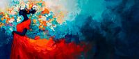 Een elegant silhouet ontvouwt zich in levendige kleurtonen, omringd door bloemenexplosies. De wisselwerking tussen intens rood en zachte blauw-, groen- en geeltinten creëert een levendige dynamiek. Dit kunstwerk voegt een muzikale noot toe aan elke woonkamer en nodigt uit om te dromen en te blijven hangen. Ideaal voor creatieve zielen op zoek naar inspiratie!