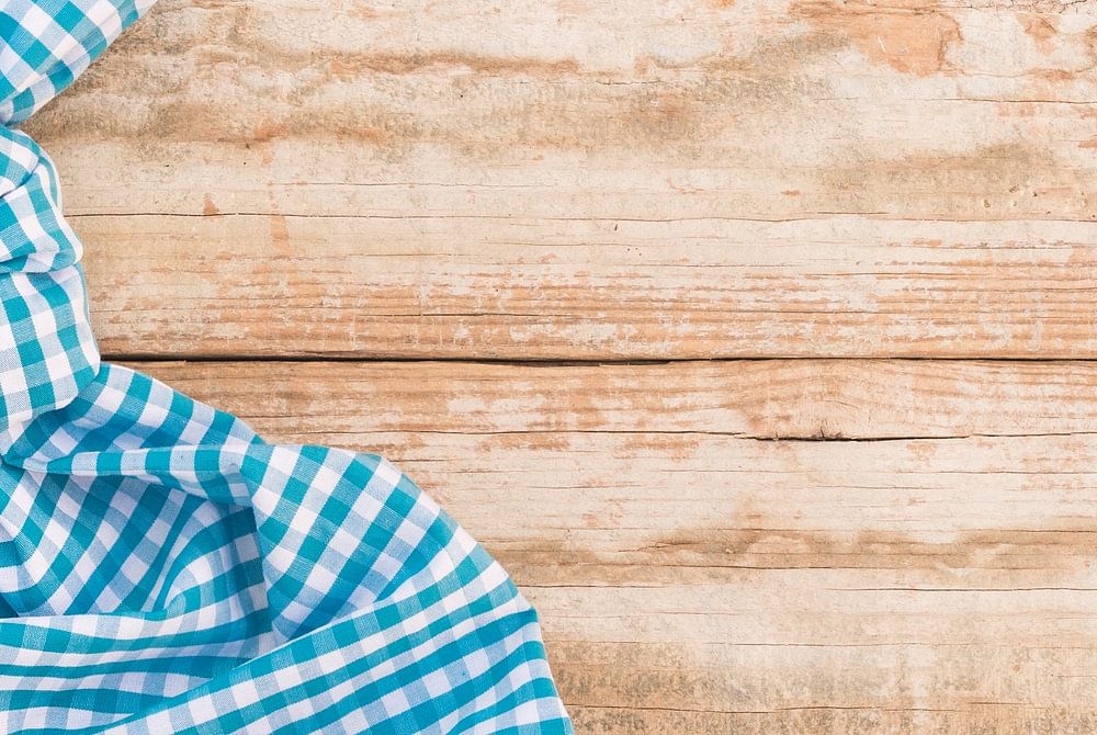 Geknoopt blauw geruit tafelkleed op rustieke houten lijstachtergrond, hoogste mening