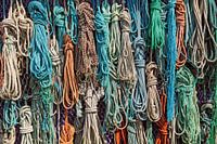 Een verzameling geknoopte scheepstouwen, hangend in lagen tegen een donkere achtergrond. De koele kleuren en verweerde vezels benadrukken textuur, herhaling en het gebruiksspoor van het materiaal.