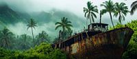 Koop de foto Gekreukt schip in de jungle van Poster Art Shop op canvas, aluminium dibond, (ingelijste) fotoprint, behang en ArtFrame, op maat geprint in Fine-Art kwaliteit.