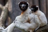 Gekroond sifaka aapje (moeder en kind) op een boom