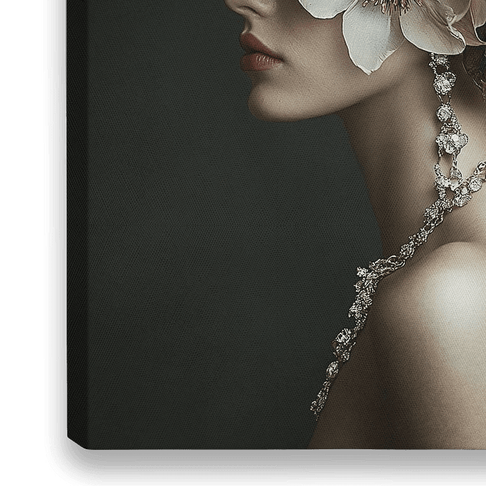 De afbeelding toont het profiel van een elegante vrouw wiens hoofd is getooid met een indrukwekkende bloemencreatie. De compositie bestaat uit grote, gedetailleerde bloemen in zachte crèmekleurige en roze tinten, aangevuld met diepdonkere bladeren en fonkelende kristallen. De bloemen zien er bijna surrealistisch uit, alsof ze uit een…