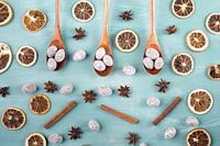 Gekruide amandelen met anijssterren en kaneel op een blauwe achtergrond
