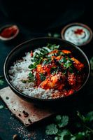 Een verleidelijk feestmaal van sappige kip, overgoten met een rijke, smaakvolle saus, troont op een bedje van malse rijst. Verse korianderblaadjes en een vleugje chilipeper zorgen voor een levendig accent. Ideaal voor in de keuken, inspireert tot culinaire avonturen en stimuleert de eetlust. Een echte blikvanger voor alle fijnproevers!