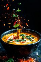 Een feestelijke rel van kleur ontvouwt zich in dit dynamische moment, waarin verse kruiden en specerijen verticaal de lucht in dwarrelen. De romige, gouden soep in de eenvoudige, donkere kom belooft plezier en warmte. Ideaal als levendig accent in de keuken of eetkamer, brengt het plezier en inspiratie bij elk kookmoment.