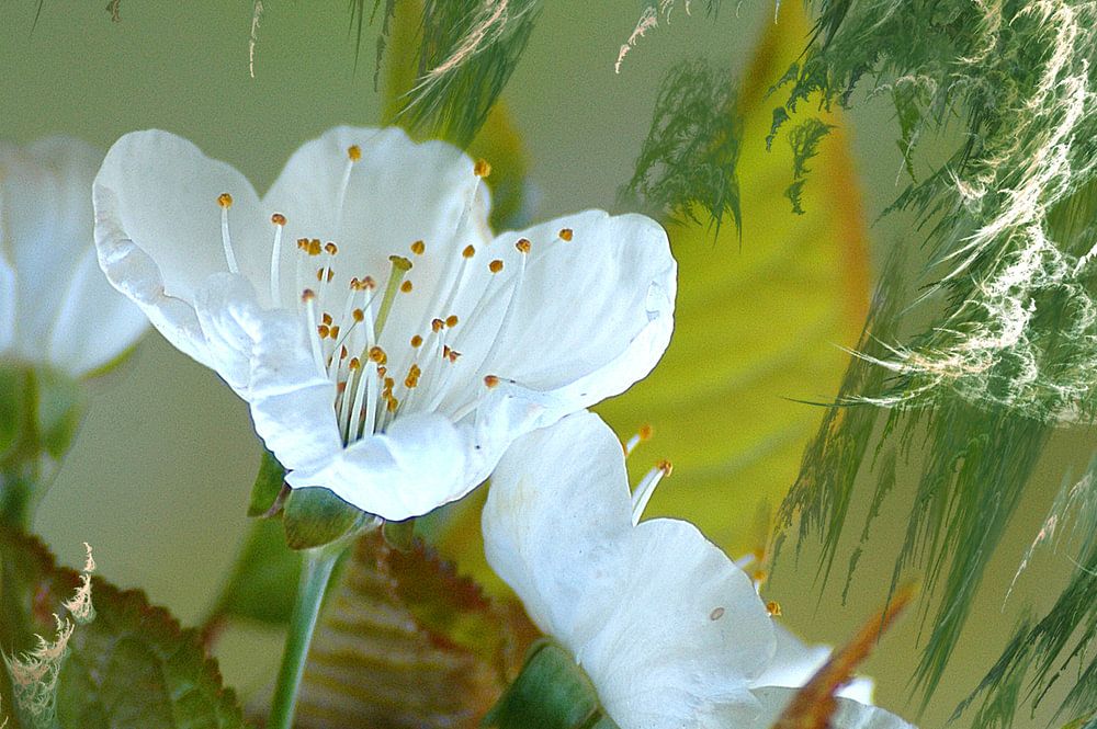 Foto van kersenbloesems versmolten met verschillende op kleur afgestemde fractals