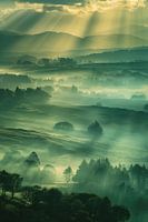 Zachte heuvels strekken zich uit in lagen van groen en nevel, waar het landschap langzaam oplost in de verte. Stralen van zonlicht breken door het wolkendek en dalen als stille banen neer over velden en bomen, alsof het land zelf wordt aangeraakt door iets groters. De ochtendmist hangt laag en vangt het licht, waardoor elke contour…