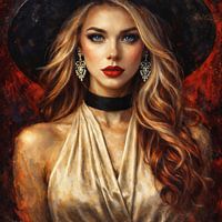 Dit portret straalt een tijdloze elegantie uit, waarin kracht en verfijning naadloos samenkomen. De intense blik trekt de toeschouwer naar binnen, terwijl warme aardetinten en diepe rood-zwarte contrasten een sfeer van mysterie en innerlijk vuur oproepen. De zachte glans van huid en stof contrasteert met de ruwe, expressieve…