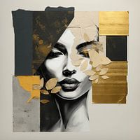 Het kunstwerk is een boeiende mix van collage en schilderkunst, waarin het portret van een vrouw naar voren komt door een gelaagdheid van texturen en materialen. De gouden en zwarte vlakken voegen een rijke visuele textuur toe en creëren een gevoel van luxe.