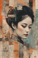 Dit mixed media-kunstwerk in collagestijl brengt traditionele en moderne invloeden samen in een krachtige, verticale compositie. De gelaagde texturen en subtiele patronen creëren diepte en ritme, terwijl een warm kleurenpalet van oranje en beige wordt geaccentueerd door frisse tinten turquoise. Culturele motieven versmelten met…
