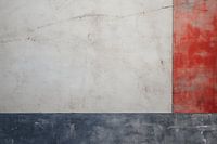 Gelaagde Kleurcontrasten - Dit is een minimalistische compositie met een krachtig kleurcontrast. De bovenste driekwart toont een verweerde witte muur met subtiele scheuren en patina, onderbroken door een kwart in rood aan de rechterkant, wat een statement maakt. Het onderste deel bestaat uit een blauwzwarte strook, die een solide basis biedt en visueel contrasteert met het rood en wit.