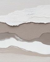 Abstracte compositie van lagen die in golvende, organische vormen over elkaar heen liggen. Het kleurenschema is neutraal en rustgevend, met tinten zoals beige, wit en lichtbruin die elkaar zacht overlappen. De textuur van elke laag is opvallend verschillend: de bovenste witte laag is ruw en korrelig, terwijl de onderliggende lagen gladder en gelijkmatiger zijn. Deze combinatie van texturen en kleuren creëert een subtiel spel tussen hard en zacht, gestructureerd en vloeiend.