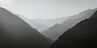 Dit is het dal van de Ribiera da Janela op Madeira. De kronkelende rivier heeft door de eeuwen heen deze bergen uitgesleten waardoor dit gelaagde effect is ontstaan. Met sterk tegenlicht van de opkomende zon geeft het een minimalistisch beeld, wat het best werkt in zwart-wit.