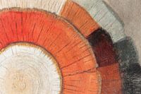 Dit werk laat een halve cirkel van jaarringen zien, opgebouwd uit warme tinten rood, oranje en roest, met subtiele overgangen naar zwart en grijsgroen. De ringen waaieren uit vanaf een lichte kern en creëren een gevoel van groei en tijd die langzaam voorbijtrekt.