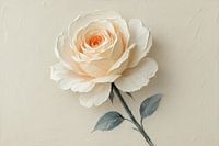 Een enkele roos met perzikkleurig hart ontvouwt gelaagde bloemblaadjes op een subtiel reliëf. De slanke stengel met twee grijsblauwe bladeren tekent een elegante diagonale lijn, terwijl zachte schaduwen diepte geven. Het rustige kleurcontrast tussen crème en perzik zorgt voor een serene, romantische sfeer. De textuur van de achtergrond…
