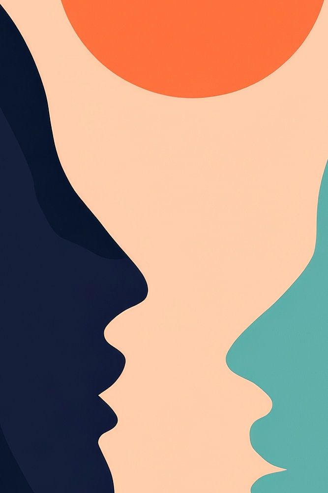 Twee gestileerde gezichten in contrasterende kleuren, mysterieus tegenover elkaar, geven elke kamer een aura van intimiteit en verbondenheid. De warm gloeiende bol zonlicht boven hen symboliseert harmonie en het samenspel van licht en schaduw. Ideaal voor de slaapkamer of woonkamer om liefde en positieve energie te bevorderen.